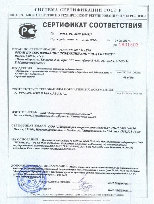 В новом продукте серии «Элемвитал» магний содержится в виде органической соли лимонной кислоты – цитрата магния. Так как цитрат является органической и хорошо растворимой формой магния, это в значительной степени обуславливает его высокую биоусвояемость. Однако хорошая растворимость в воде – далеко не единственная особенность цитрата магния, имеющего широкий спектр действия: